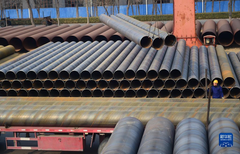 2月7日,河北鹽山縣一家管道企業(yè)的工人在轉運鋼管。