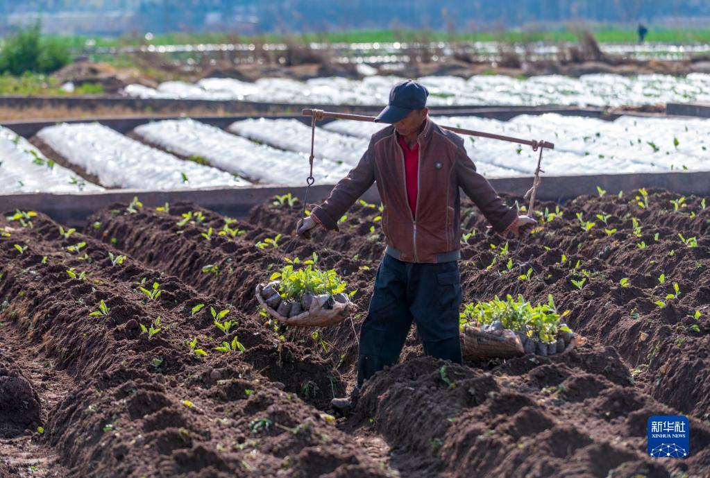 2月7日,在云南省大理白族自治州南澗彝族自治縣楊免莊村,農民在田間運送蔬菜苗。