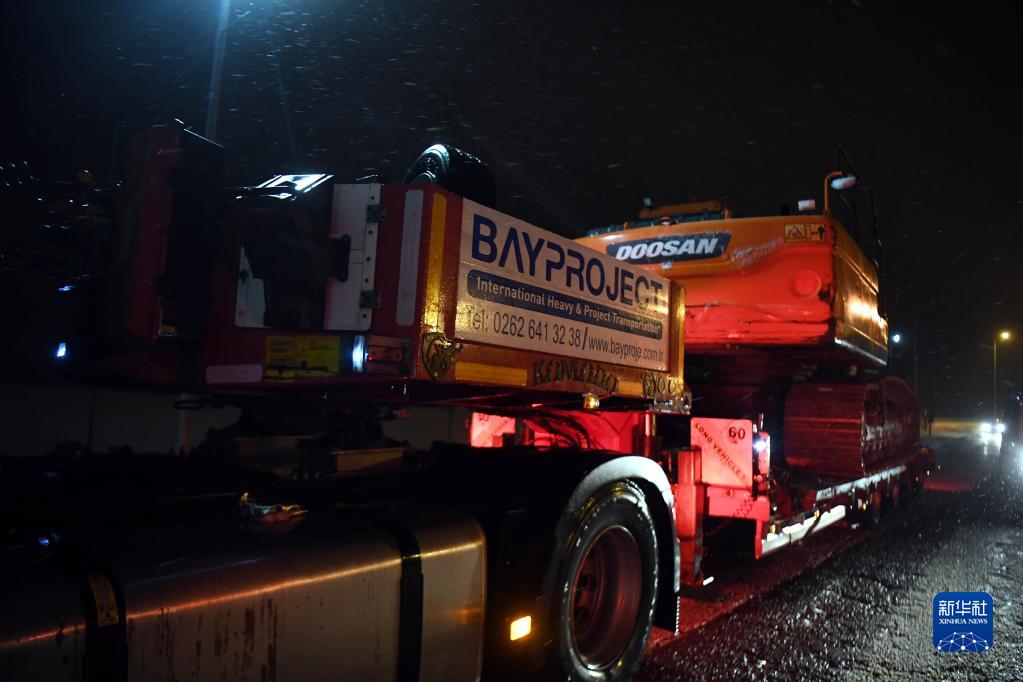 這是2月6日晚在土耳其伊斯坦布爾至安卡拉公路上拍攝的運往災區的大型機械。