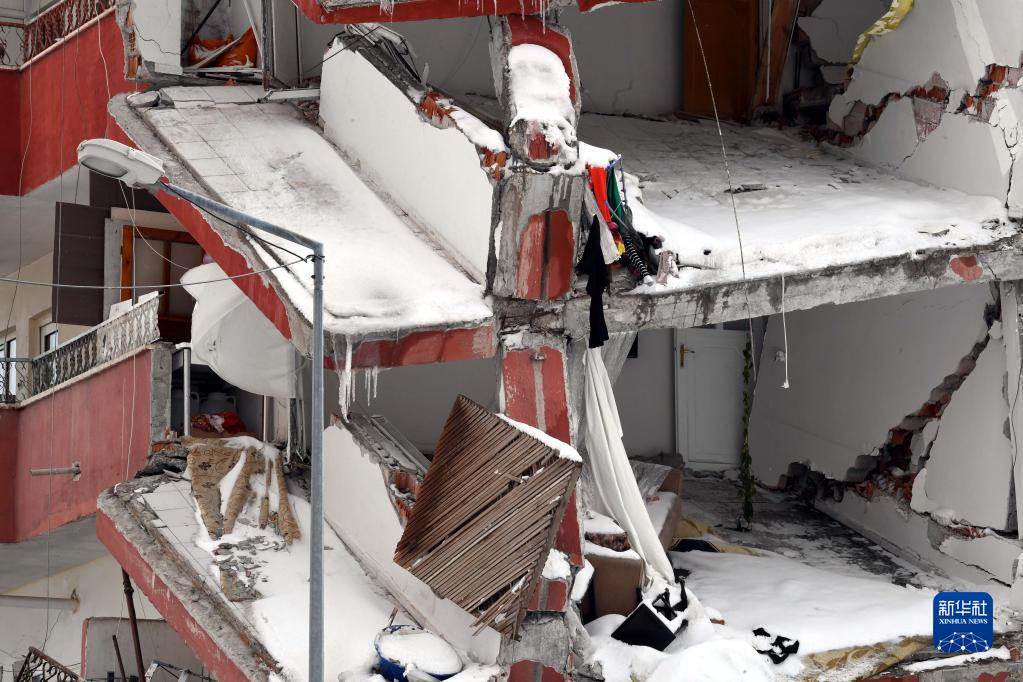 這是2月7日在土耳其卡赫拉曼馬拉什省的埃爾比斯坦地區拍攝的地震中受損的建筑物。