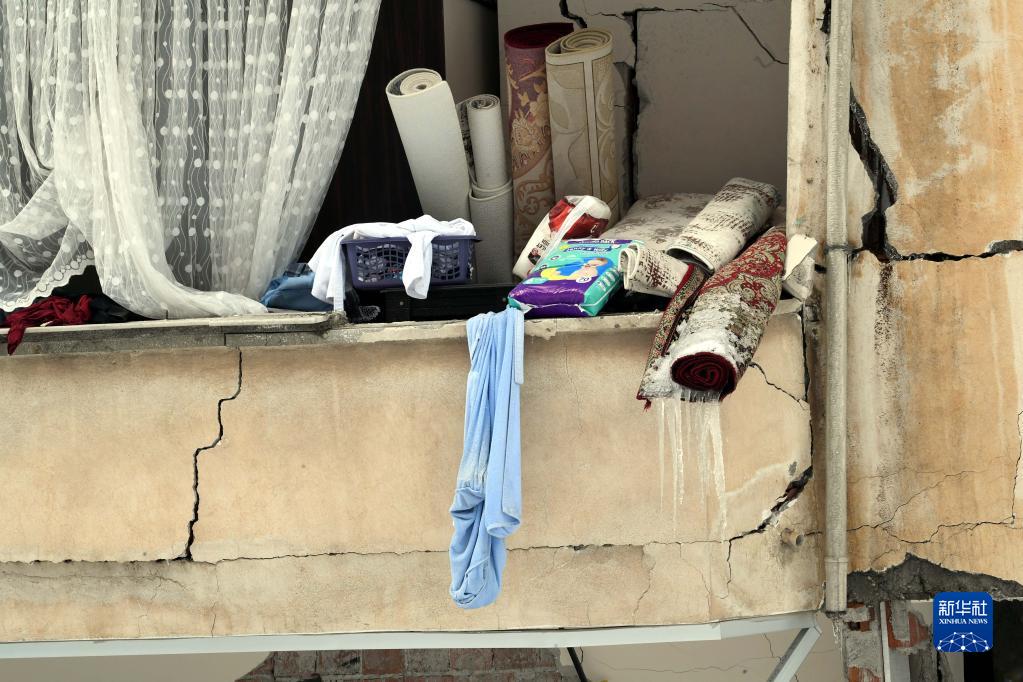 這是2月7日在土耳其卡赫拉曼馬拉什省的埃爾比斯坦地區拍攝的地震中受損的建筑物。