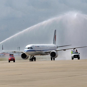 2月7日,國航航班在柬埔寨首都金邊國際機場(chǎng)接受水門(mén)禮。