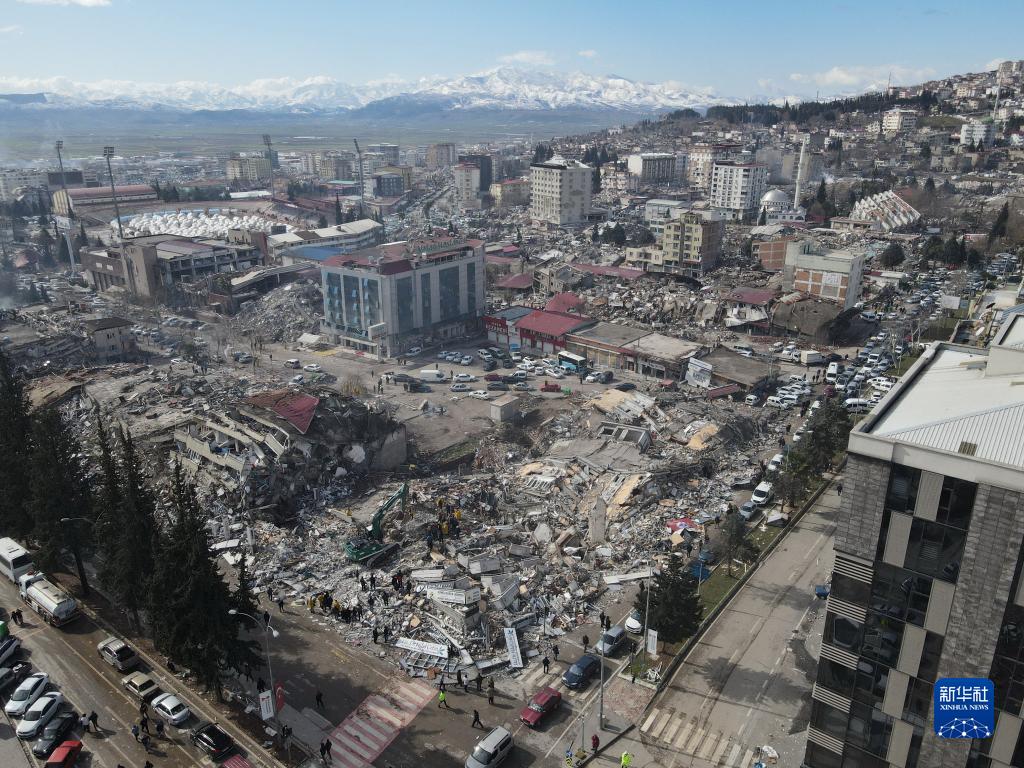 這是2月7日在土耳其南部卡赫拉曼馬拉什市市中心拍攝的震后景象(無(wú)人機照片)??ê绽R拉什市是本次地震重災區卡赫拉曼馬拉什省省會(huì ),是遭受地震破壞最為嚴重的城市之一。