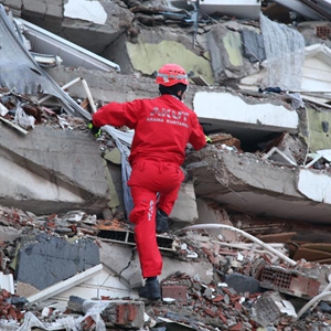 2月7日,在土耳其南部卡赫拉曼馬拉什市市中心,救援人員在搜救??ê绽R拉什市是本次地震重災區卡赫拉曼馬拉什省省會(huì ),是遭受地震破壞最為嚴重的城市之一。