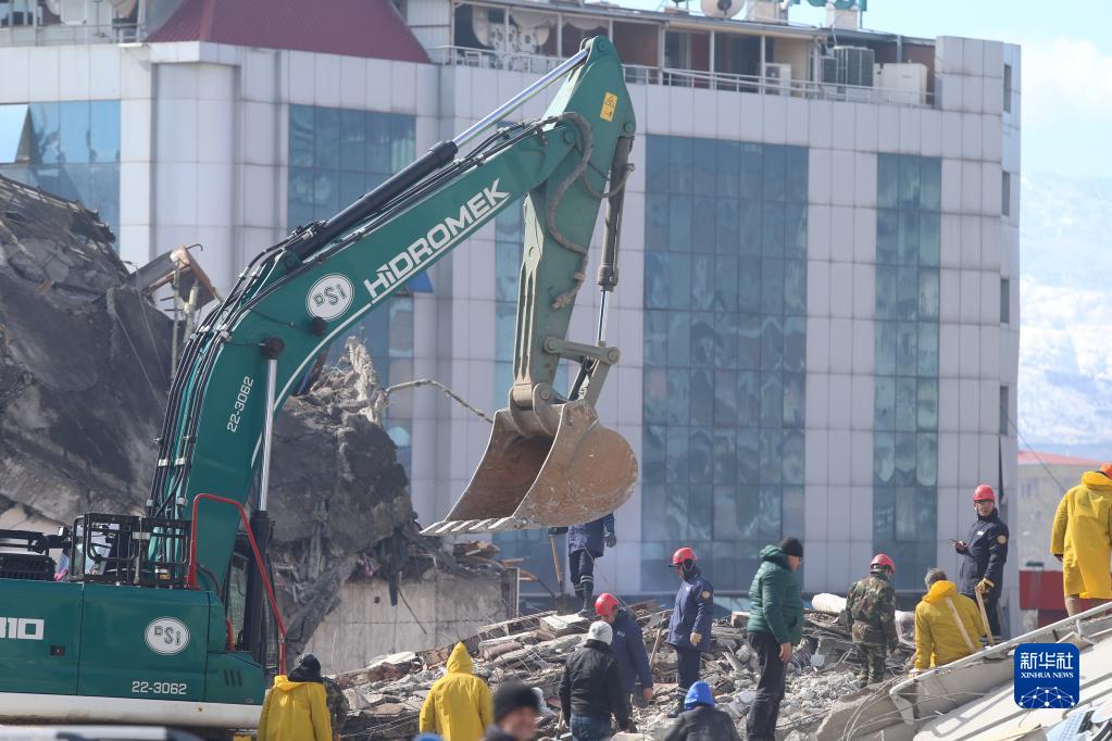 2月7日,救援人員在土耳其南部卡赫拉曼馬拉什市地震廢墟中搜尋幸存者。