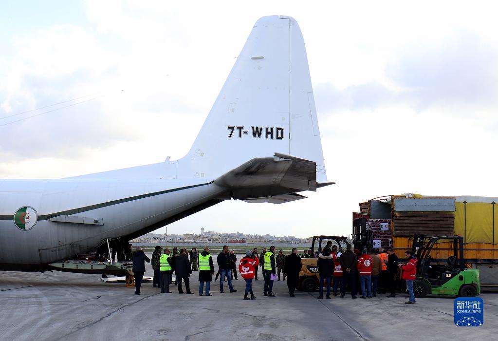 2月7日,在敘利亞阿勒頗國際機場(chǎng),工作人員卸載阿爾及利亞提供的救援物資。
