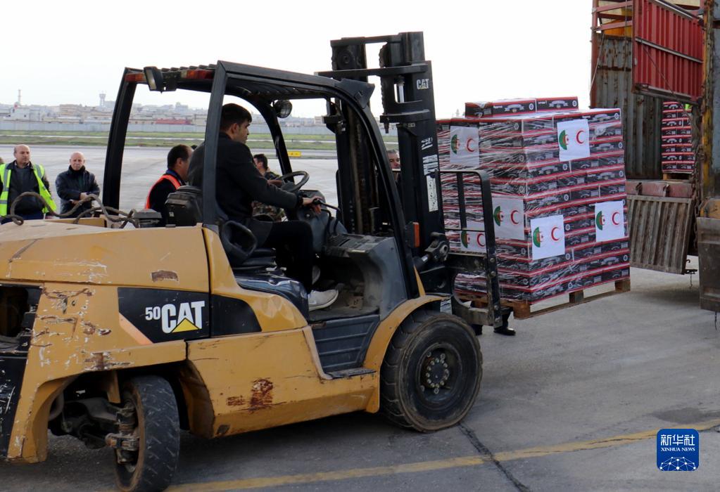 2月7日,在敘利亞阿勒頗國際機場(chǎng),工作人員卸載阿爾及利亞提供的救援物資。