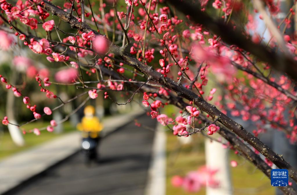 2月7日,浙江省舟山市新城綠化帶的數株紅梅悄然綻放,成為一道美麗的風(fēng)景線(xiàn)。