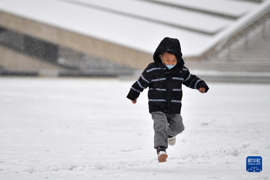 2月8日,一名小朋友在甘肅大劇院門(mén)前的雪地里玩耍。