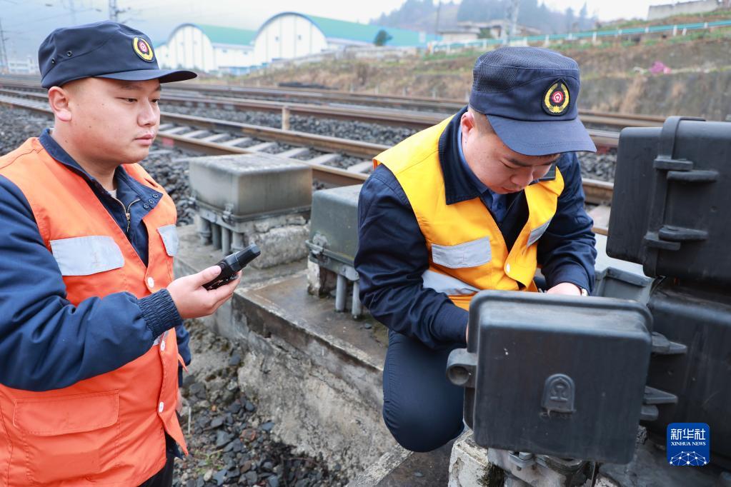 2月8日,貴陽(yáng)電務(wù)段工作人員攜帶著(zhù)北斗防護系統設備進(jìn)行作業(yè)。
