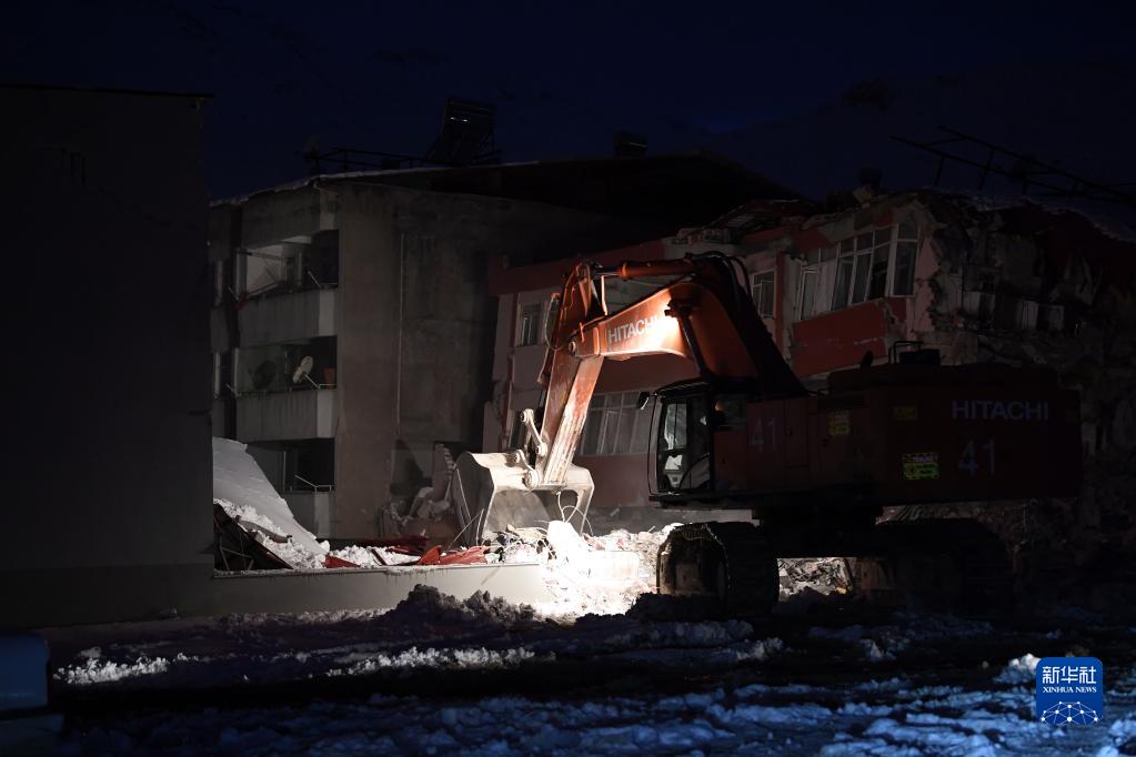 2月7日晚,在土耳其卡赫拉曼馬拉什省南部的埃爾比斯坦地區,救援人員在一處地震廢墟搜救。