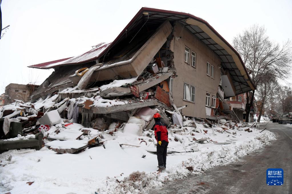 2月7日,在土耳其卡赫拉曼馬拉什省南部的埃爾比斯坦地區,救援人員在一處受損建筑外喊話(huà)。
