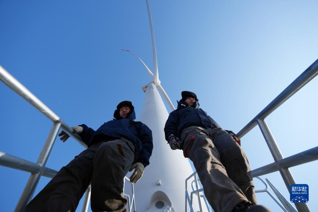 2月7日,在華電黑龍江區域哈爾濱依蘭雞冠山風(fēng)電場(chǎng)三期工程一處運行的風(fēng)電機組,工作人員在進(jìn)行巡檢。