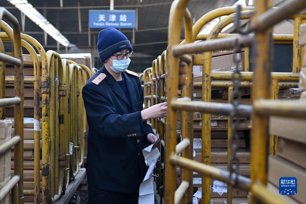 2月8日,在天津站1站臺,工作人員在給貨物貼簽。
