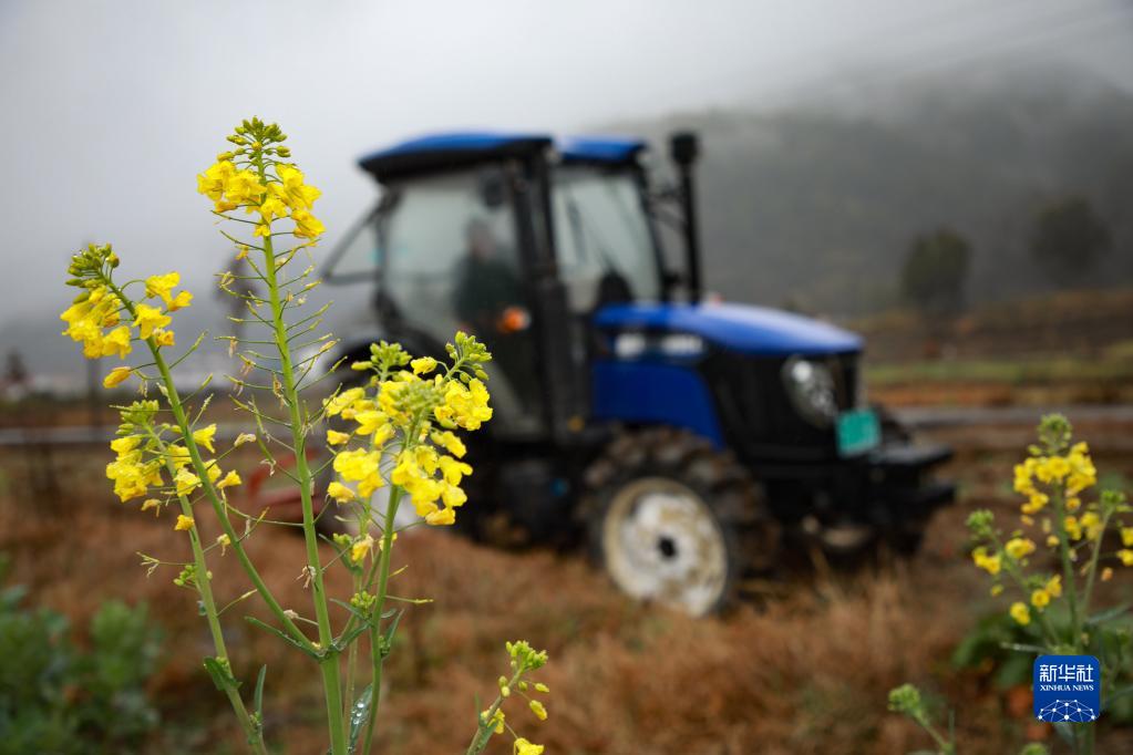 2月8日,貴州省龍里縣灣灘河鎮走馬村農民駕駛農機在田里翻耕土地。