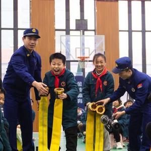 2月8日,在常德市武陵區第一小學(xué)體育館,消防隊員指導學(xué)生打開(kāi)消防水帶。