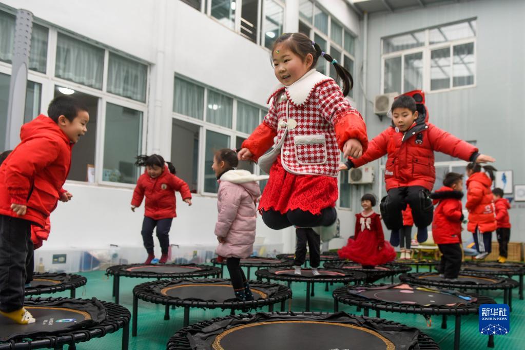 2月8日,浙江省寧波市鎮海區澥浦鎮中心幼兒園的孩子們在蹦床上練習基本功。