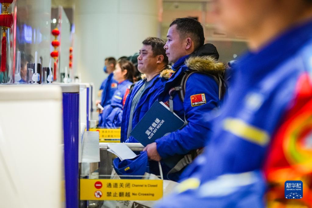 2月8日,藍天救援隊隊員在進(jìn)行邊防檢查,準備登機。