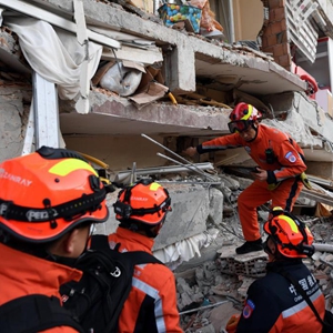 2月8日,中國救援隊隊員在土耳其哈塔伊的一處地震廢墟搜救。