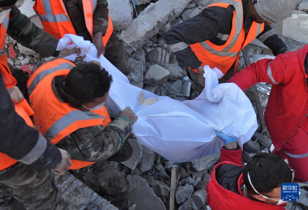 2月8日,救援人員在敘利亞拉塔基亞省的一處地震廢墟轉移遇難者遺體。
