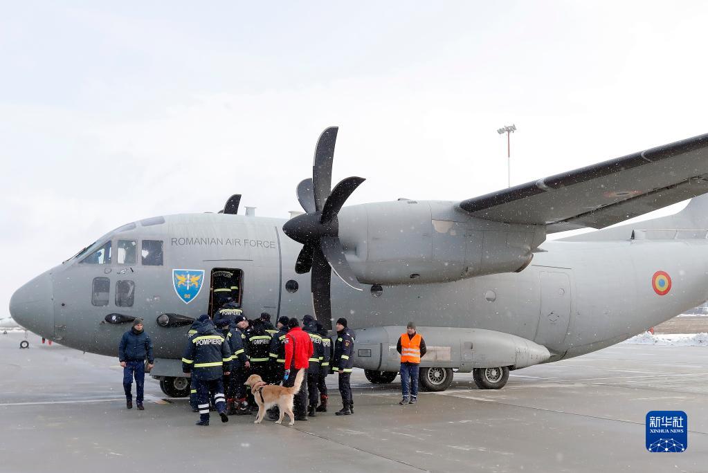 2月8日,在羅馬尼亞布加勒斯特附近的軍用機場(chǎng),救援人員登機準備飛赴土耳其。