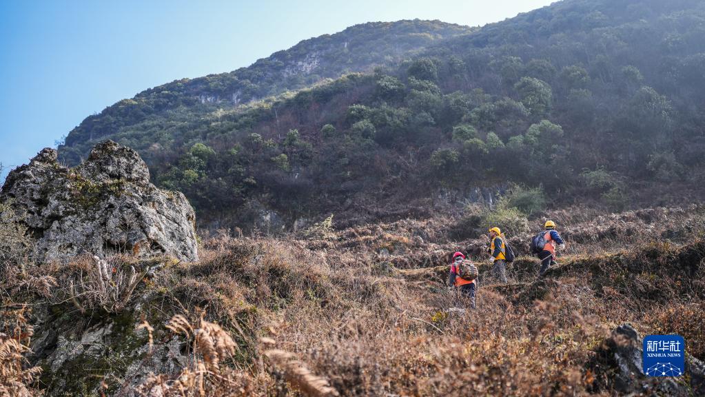 六盤(pán)水工電段職工在滬昆鐵路茨沖至濫壩區段登山巡檢(2月8日攝)。