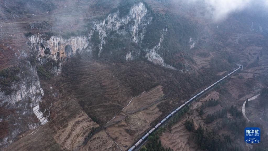 列車(chē)從滬昆鐵路茨沖至濫壩區段駛過(guò)(2月8日攝,無(wú)人機照片)。
