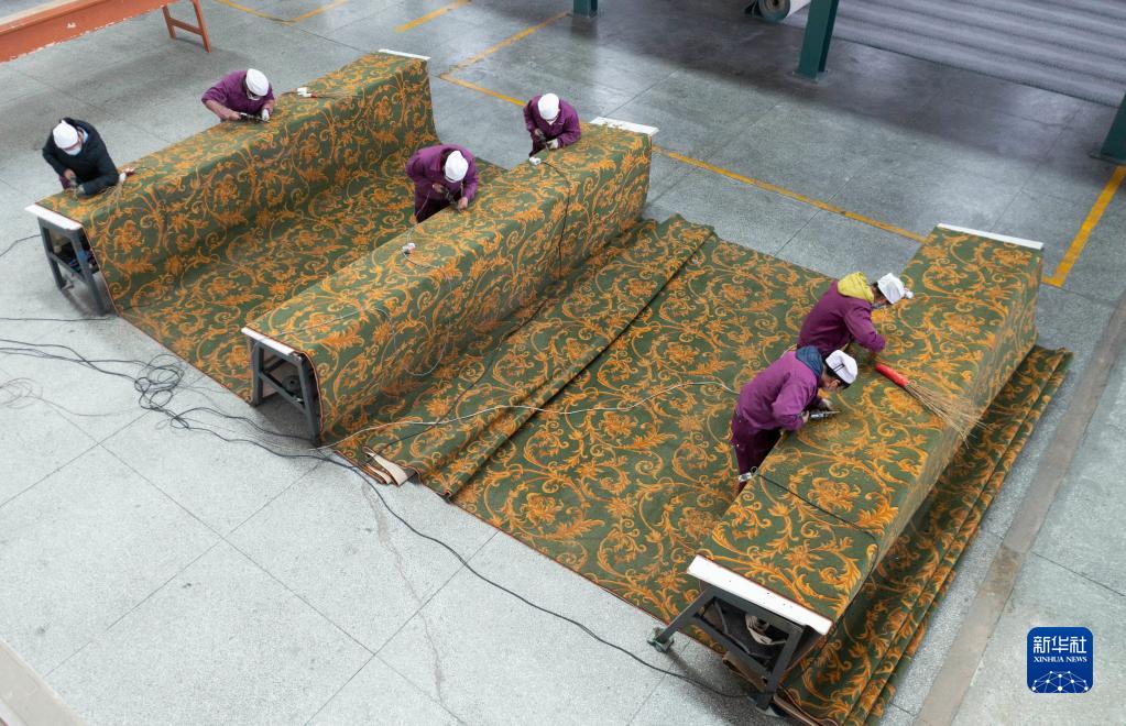 在青海省西寧市圣源地毯集團有限公司生產(chǎn)車(chē)間,操作工在為地毯剪花(2月4日攝)。