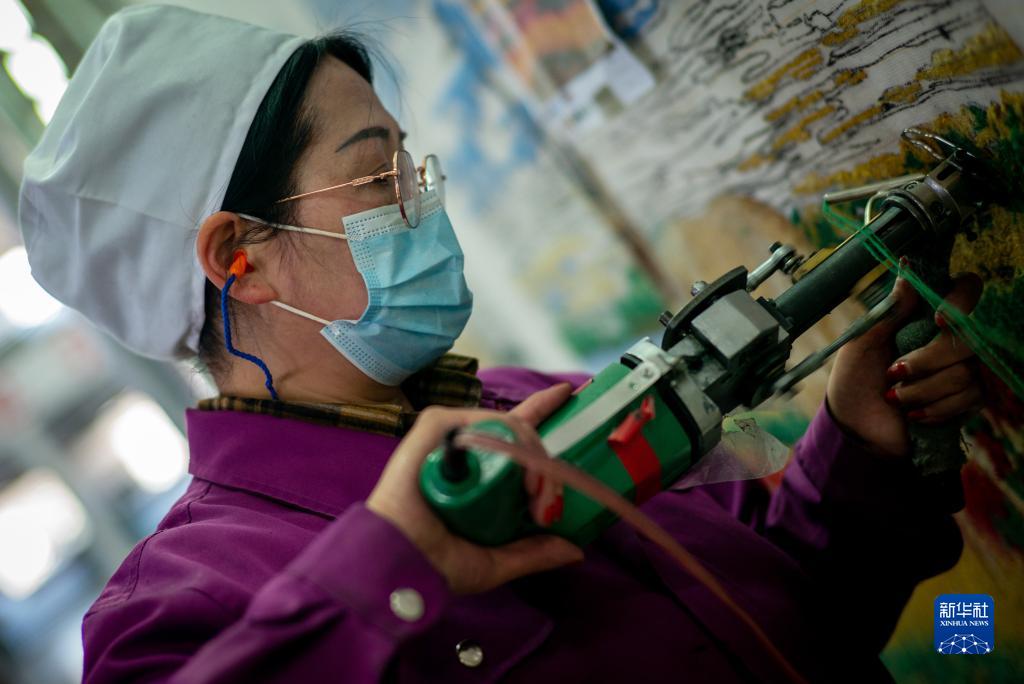 操作工在青海省西寧市圣源地毯集團有限公司生產(chǎn)車(chē)間使用槍刺工藝制作地毯(2月4日攝)。
