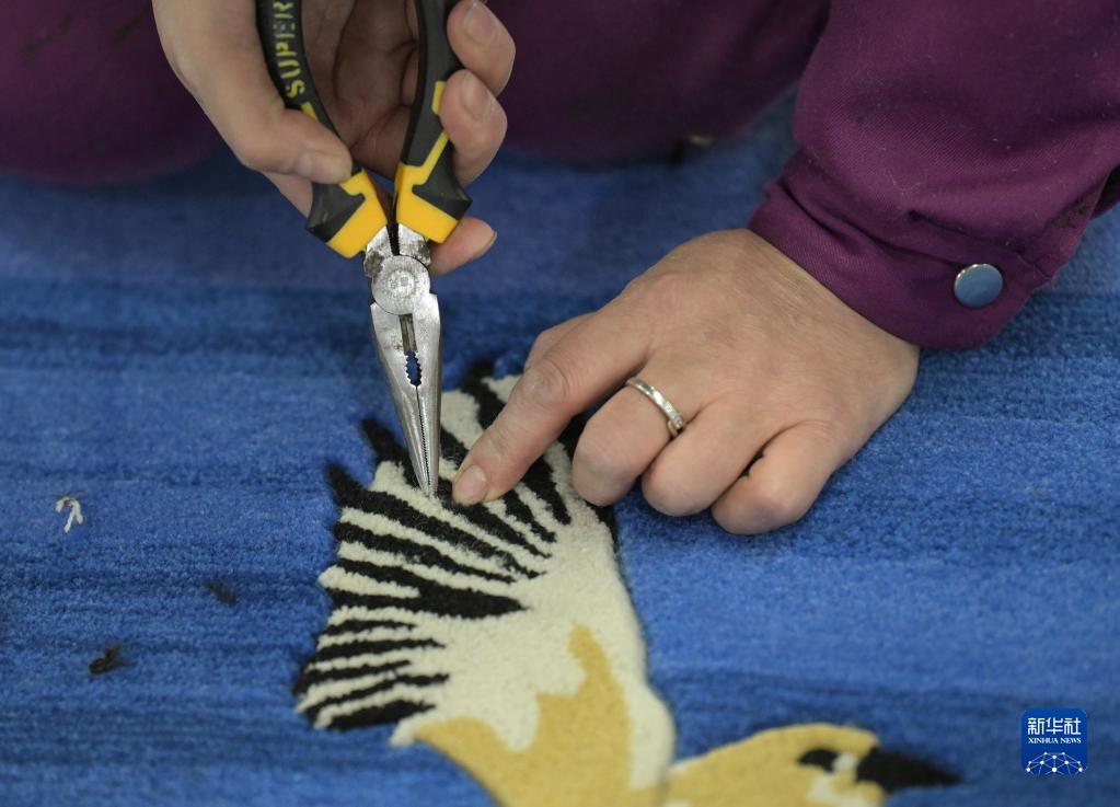 一位女工在圣源地毯集團有限公司生產(chǎn)車(chē)間為地毯清理拔花刺(2月4日攝)。
