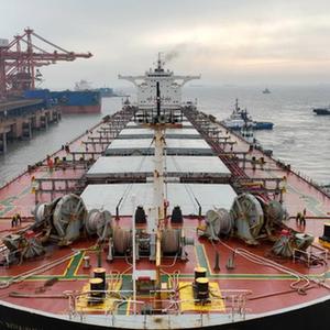 2月9日,一艘輪船在拖輪協(xié)助下向唐山港曹妃甸港區礦石碼頭靠泊(無(wú)人機照片)。