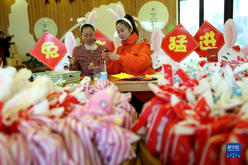 2月9日,福建武夷山百花幼兒園的老師們在為孩子們準備兔年福袋。