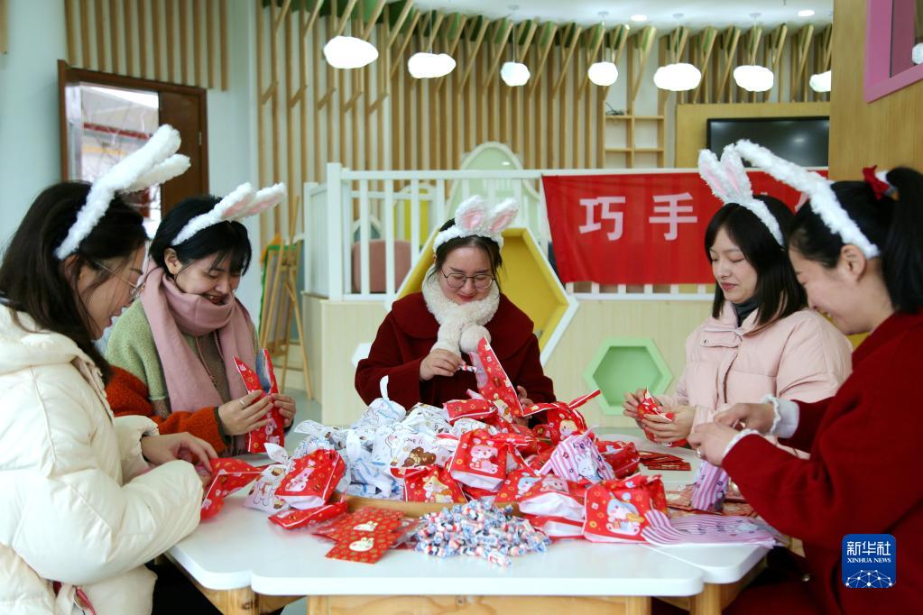2月9日,福建武夷山百花幼兒園的老師們?yōu)楹⒆觽儨蕚渫媚旮4?/p>