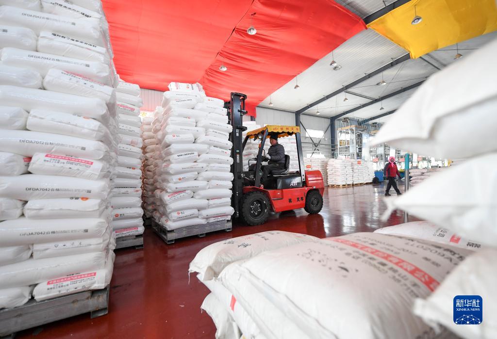 2月9日,西吉縣金曜塑業(yè)公司工人操作叉車(chē)搬運生產(chǎn)地膜的聚乙烯樹(shù)脂原料。
