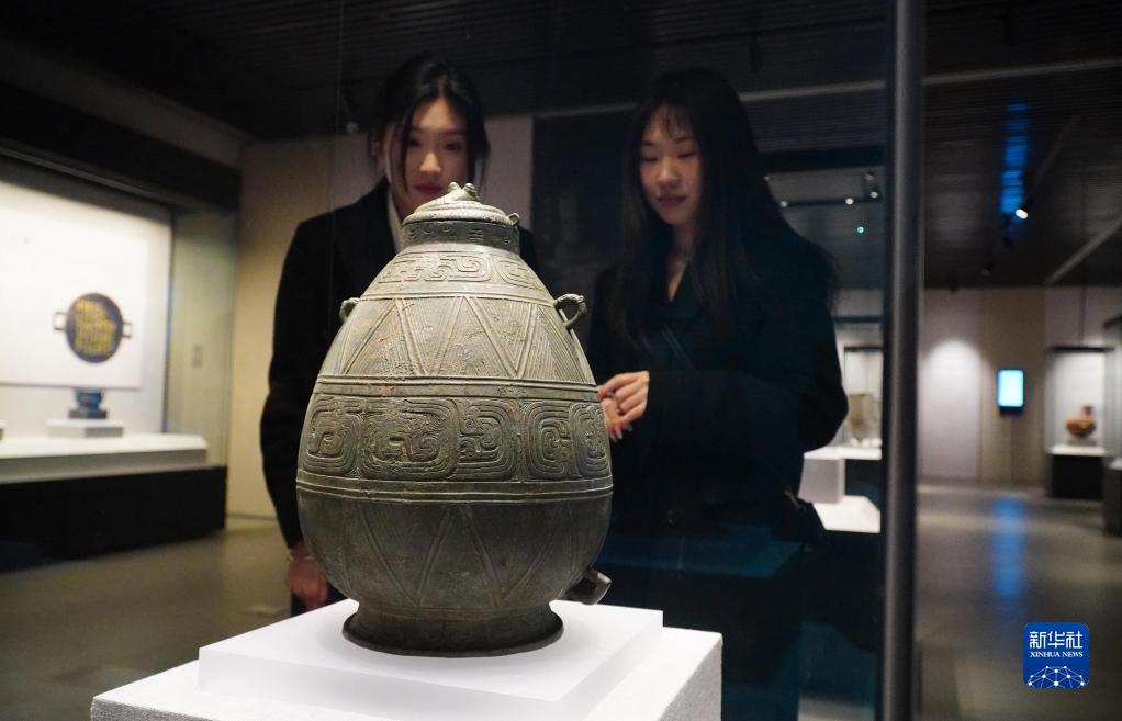 2月9日,在孔子博物館舉行的山東文物精品展上,參觀(guān)者在觀(guān)看孔子博物館收藏的西周青銅器侯母壺。