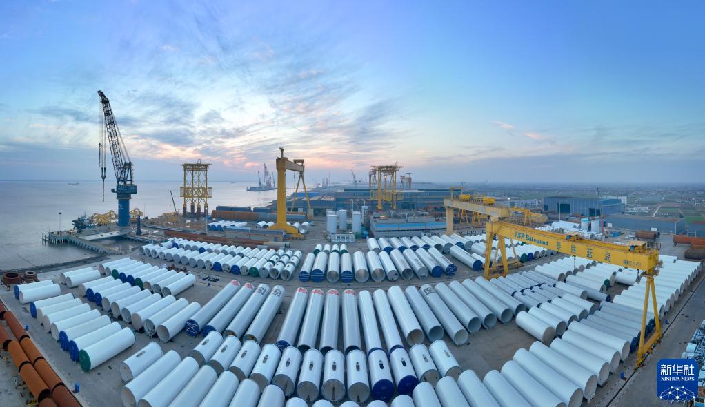 等待交付的海上風(fēng)電場(chǎng)風(fēng)機塔筒(2月7日攝,無(wú)人機照片)。