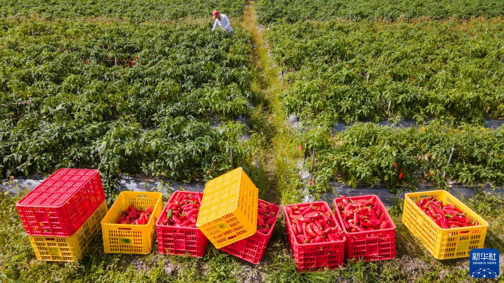 2月9日,海南省瓊海市潭門(mén)鎮福田村的農民在采摘辣椒。(無(wú)人機照片)