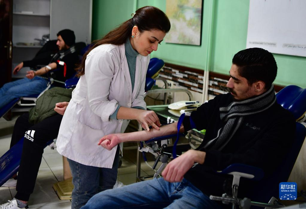 2月8日,民眾在敘利亞首都大馬士革一處獻血中心獻血。
