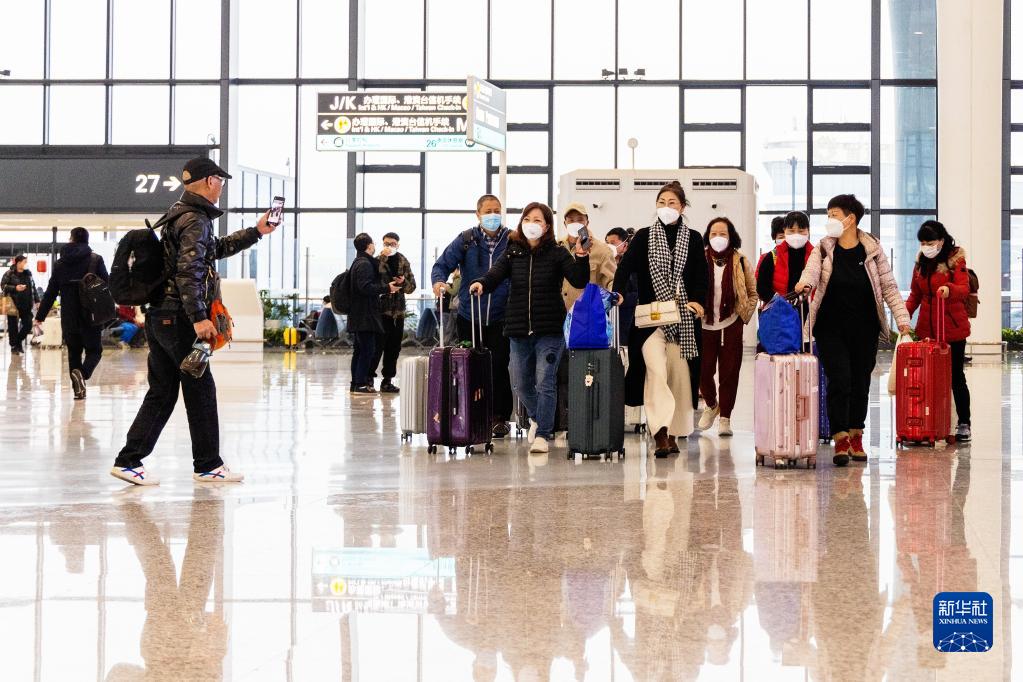 2月8日,前往印尼巴厘島的旅行團旅客在杭州蕭山國際機場(chǎng)T4航站樓候機。