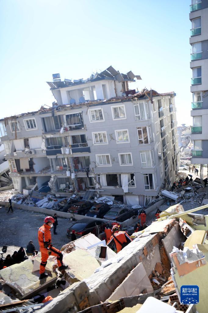 2月9日,中國救援隊隊員在土耳其哈塔伊省安塔基亞市的受損建筑上開(kāi)展救援工作。