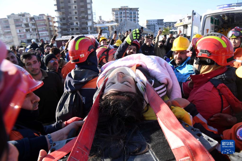 在土耳其南部地震重災區哈塔伊省安塔基亞市,中國救援隊同土耳其救援隊合作,于當地時(shí)間9日下午救出一名被埋在樓房廢墟下的女性幸存者。新華社記者 沙達提 攝
