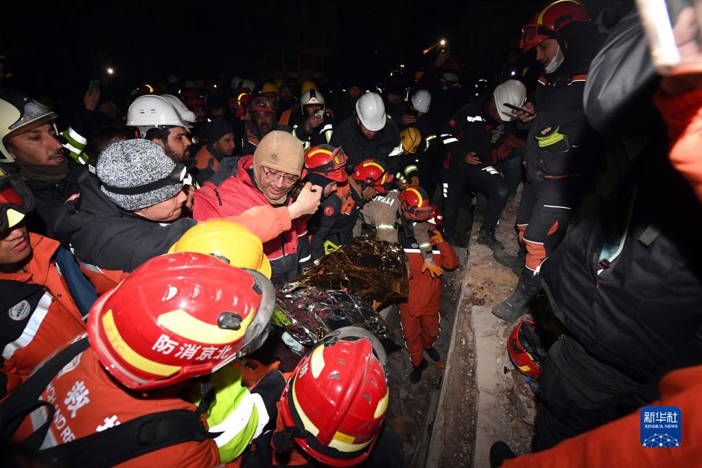 2月9日晚,在土耳其哈塔伊省安塔基亞市,中國救援隊與土耳其救援隊合力營(yíng)救出的幸存者被抬出廢墟。
