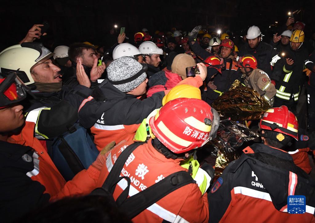 2月9日晚,在土耳其哈塔伊省安塔基亞市,中國救援隊與土耳其救援隊合力營(yíng)救出的幸存者被抬出廢墟。