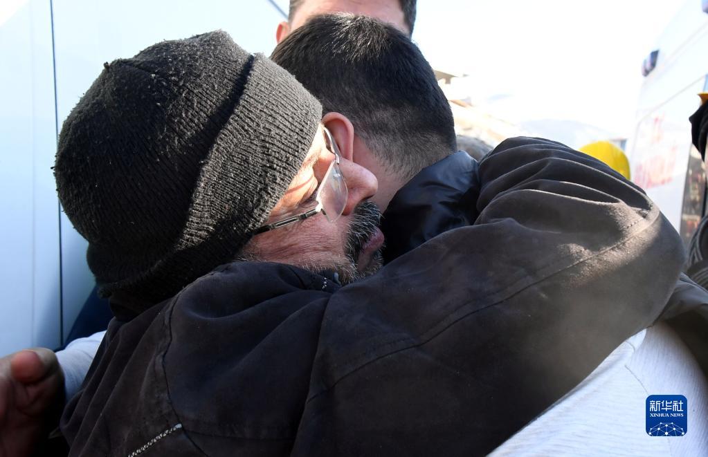 2月9日,在土耳其哈塔伊省安塔基亞市,救出的女性幸存者的親人擁抱致意。