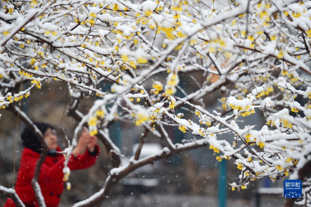 2月9日,石家莊市平安公園臘梅園,市民欣賞拍攝雪中臘梅。