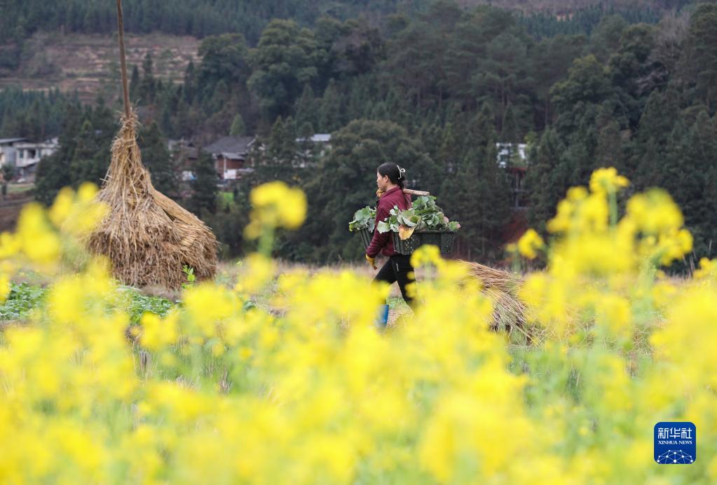 2月9日,村民在貴州省黔東南苗族侗族自治州從江縣剛邊壯族鄉三聯(lián)村田間挑運蔬菜。