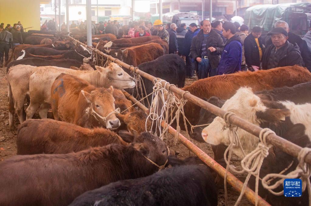 2月9日,在湖南省永州市道縣壽雁鎮活牛交易市場(chǎng),農戶(hù)在選購耕牛。