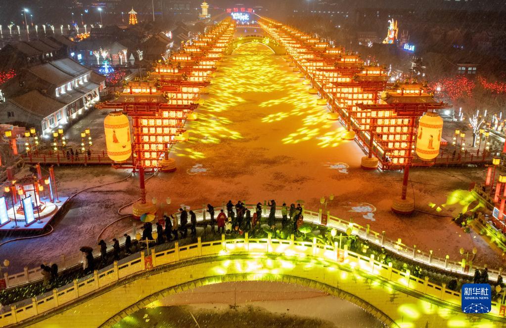 2月9日,游客在唐山市豐南區河頭老街踏雪觀(guān)光(無(wú)人機照片)。