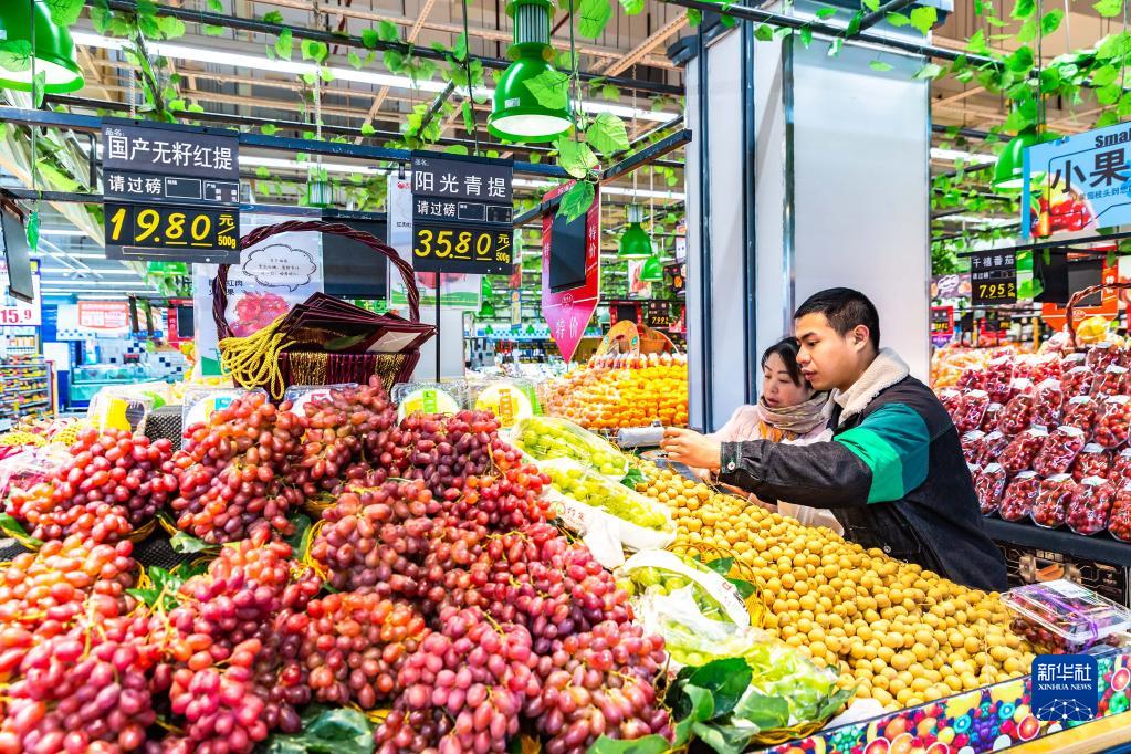 2月10日,消費者在貴州省安順市西秀區一家超市選購水果。