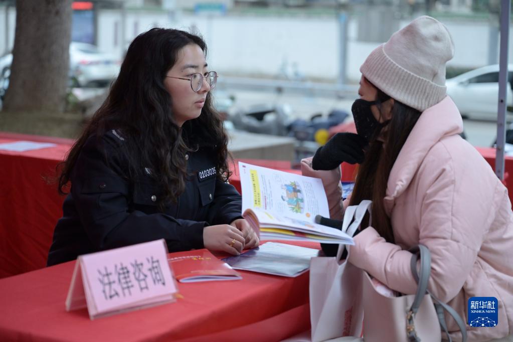 2月10日,在合肥市蜀山區環(huán)球金融廣場(chǎng)舉行的招聘會(huì )上,工作人員(左)為求職者提供法律咨詢(xún)。
